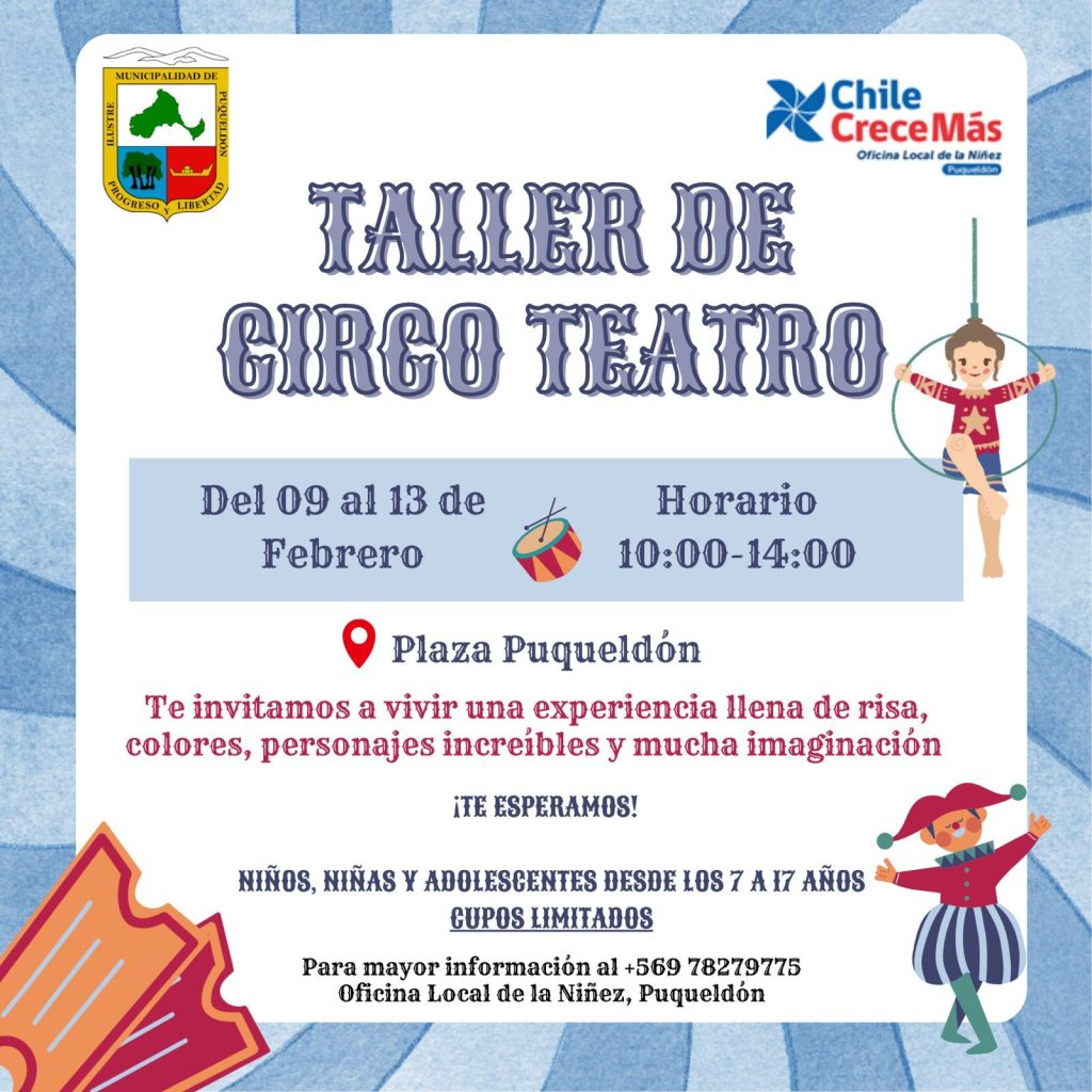 La Ilustre Municipalidad de Puqueldón, en conjunto con la Oficina Local de la Niñez (OLN), invita cordialmente a niños, niñas y adolescentes de la comuna a ser parte del Taller de Circo Teatro, una entretenida y formativa experiencia artística pensada para fomentar la creatividad, la expresión corporal y el trabajo en equipo.